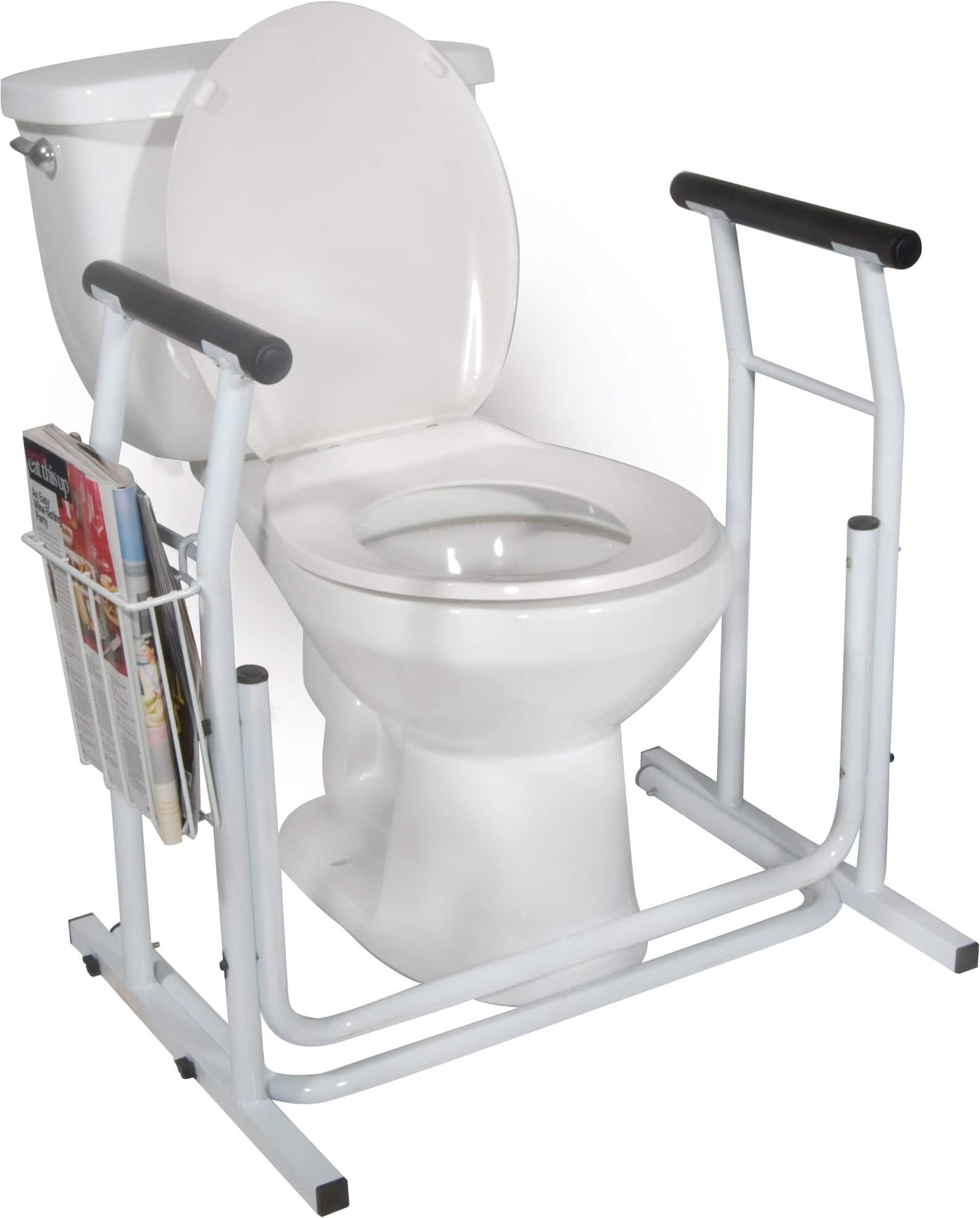 The Stand Alone Toilet Safety Rail fits most standard and elongated toilets. Comes with padded armrest for added comfort and a magazine rack for added convenience. Easy, tool free assembly.