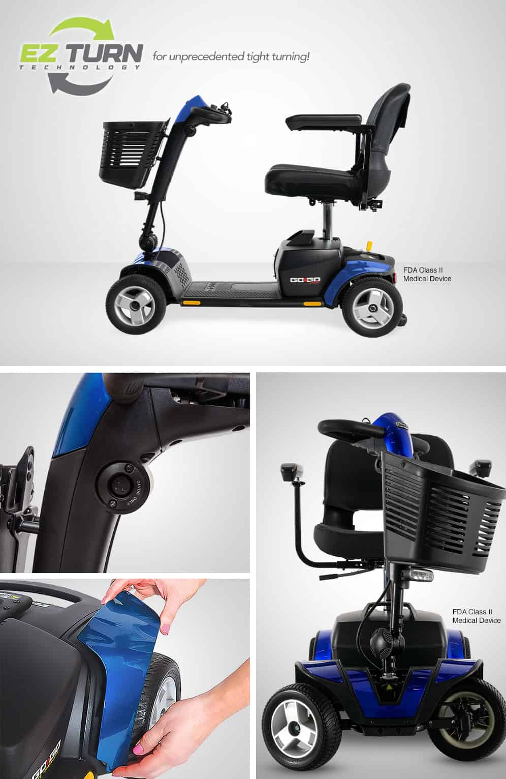 Experience unique 4-wheel mobility. The Go Go® Sport boasts Pride’s patented EZ Turn technology, which offers 3-wheel turning ability to help you navigate tighter areas with ease. You can enjoy the versatility of driving a compact mobility scooter that fits your every need. It features ample storage, simple navigation, and is so easy to transfer from your home, into your car, then to your destination.
