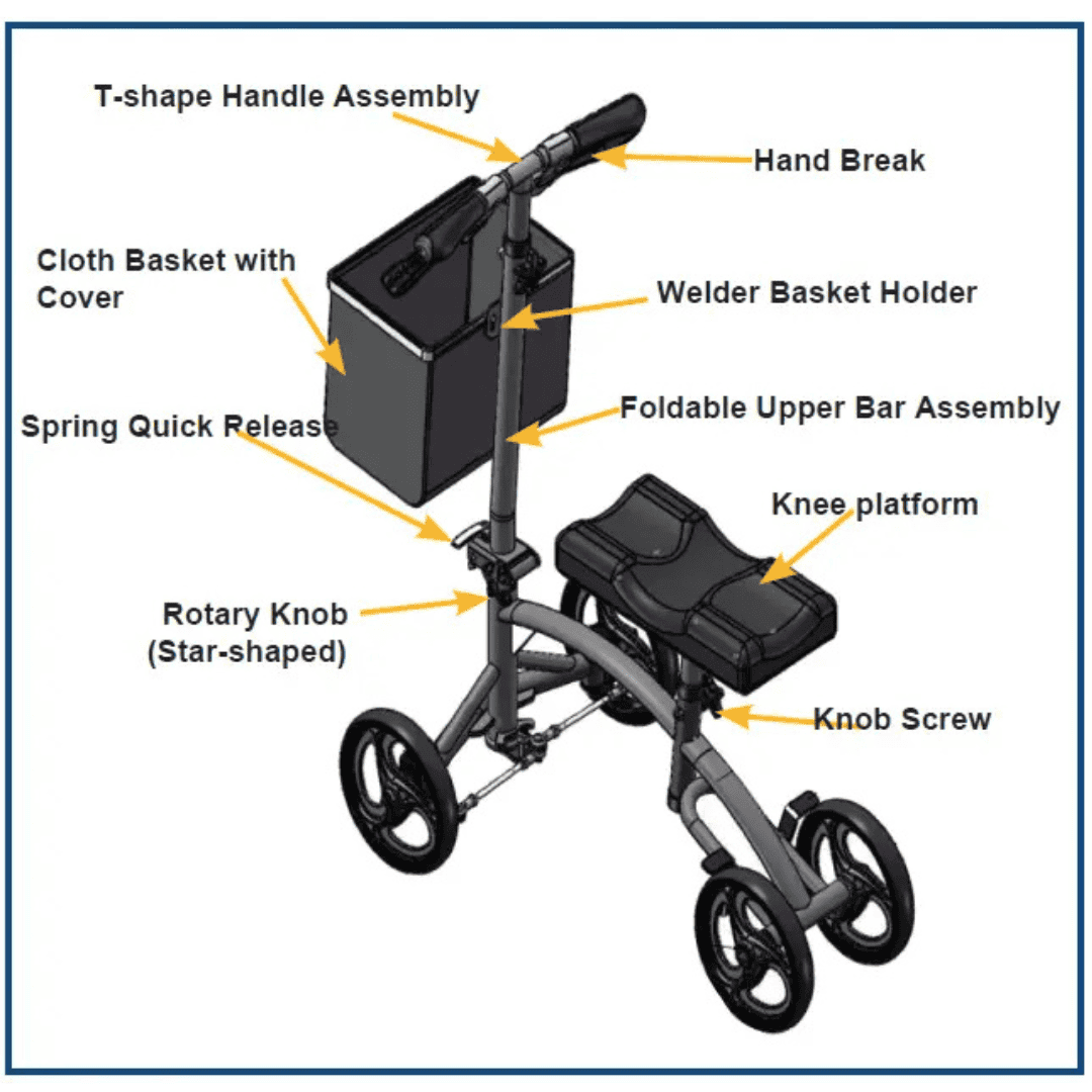 Comfort is prioritized with a two-piece padded knee platform that supports the injured leg without pressure or strain. Both the handlebar height (34″–40″) and kneepad height (17″–22″) adjust easily with tool-free mechanisms, ensuring a proper fit for a wide range of users.