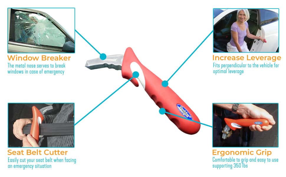 But the HandyBar is more than just a support handle—it also includes essential built-in emergency tools, including a seat belt cutter and window breaker for added peace of mind.