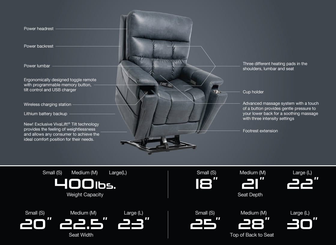 Convenience is built in, too—enjoy a hideaway wireless charging station, a discreet cup holder, USB charging port, and an easy-to-use ergonomic toggle remote with a programmable memory button. A lithium battery backup ensures the chair remains operational during power outages. Available in Small, Medium, and Large sizes, and finished in elegant Capriccio fabrics, the VivaLift!® Ultra blends therapeutic comfort with refined style from Pride Mobility.