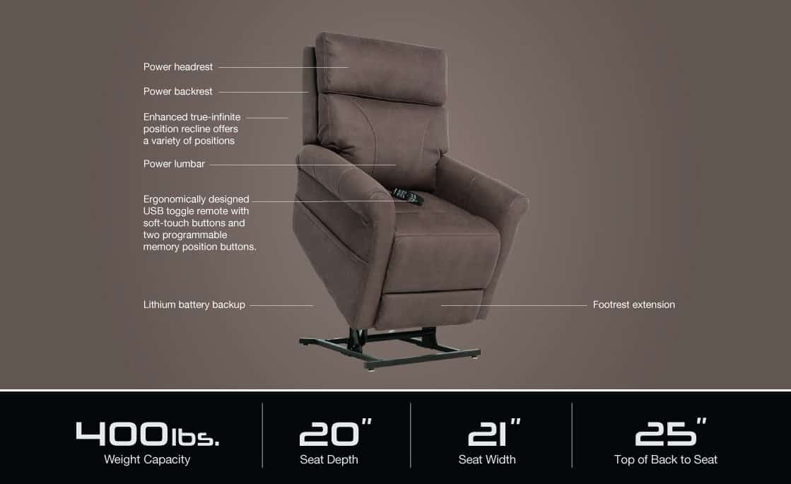 The Urbana 2 combines advanced technology with contemporary style, allowing you to unwind fully after a long day. With independent backrest and footrest movement, power headrest, lumbar support, and programmable memory positions, this lift chair ensures you’ll always find your perfect recline. Built with soft-touch fabrics and a 400 lb weight capacity, it’s engineered for long-lasting comfort and support.